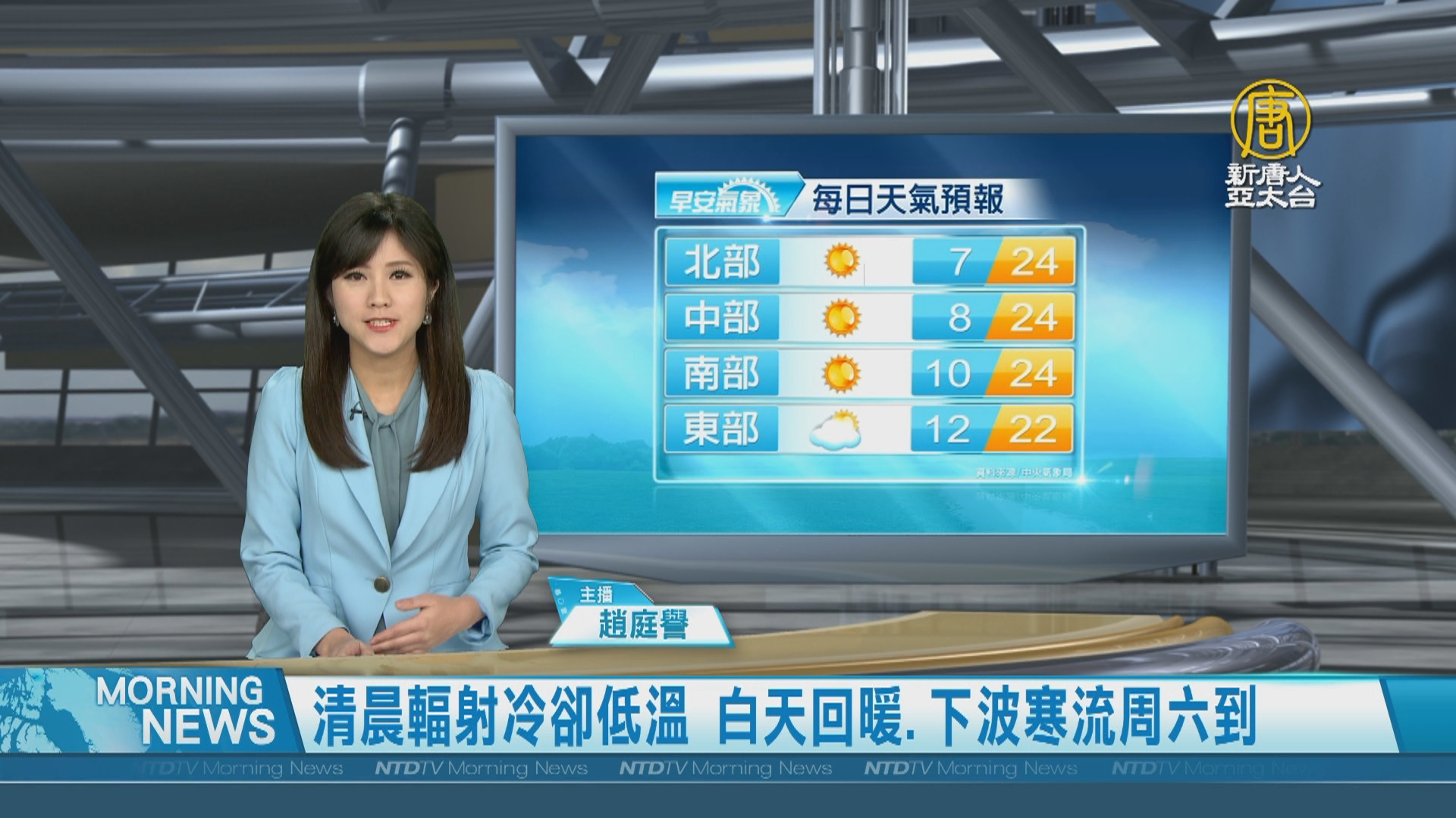 【新唐人亞太台 2021 年 01 月 14 日訊】歡迎您收看1月14日的早安新唐人,我是趙庭譽,先來帶您關心今天的天氣情況。因為輻射冷卻效應,昨天今天的清晨仍然低溫,昨天全台最低溫是苗栗造橋,只有1.5度不過,白天會在回溫,一直到星期五,天氣晴朗穩定,但晚上還是會降到11至13度左右,周五晚上接近寒流等級的冷空氣南下,周六、日全台降溫,北台灣轉濕冷,提醒觀眾朋友留意保暖。帶您一起來看到國際媒體重要訊息。