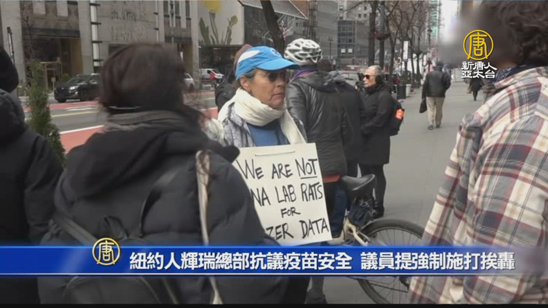 【新唐人亞太台 2021 年 01 月 14 日訊】多位紐約民眾週三中午,到紐約輝瑞製藥公司總部門外抗議,反對議員提議要 州政府向民眾強制性施打疫苗。