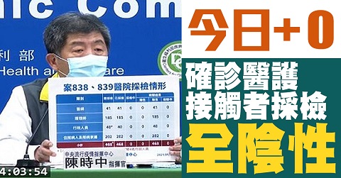 陳時中表示,案838、839醫院部分共匡列468人,採檢都是陰性,其中有77人為密切接觸者,經二採也都是陰性,而社區匡列共55人(包括839), 採檢也都是陰性。顯示周圍第一圈都沒有確診情況,是不幸中的大幸。