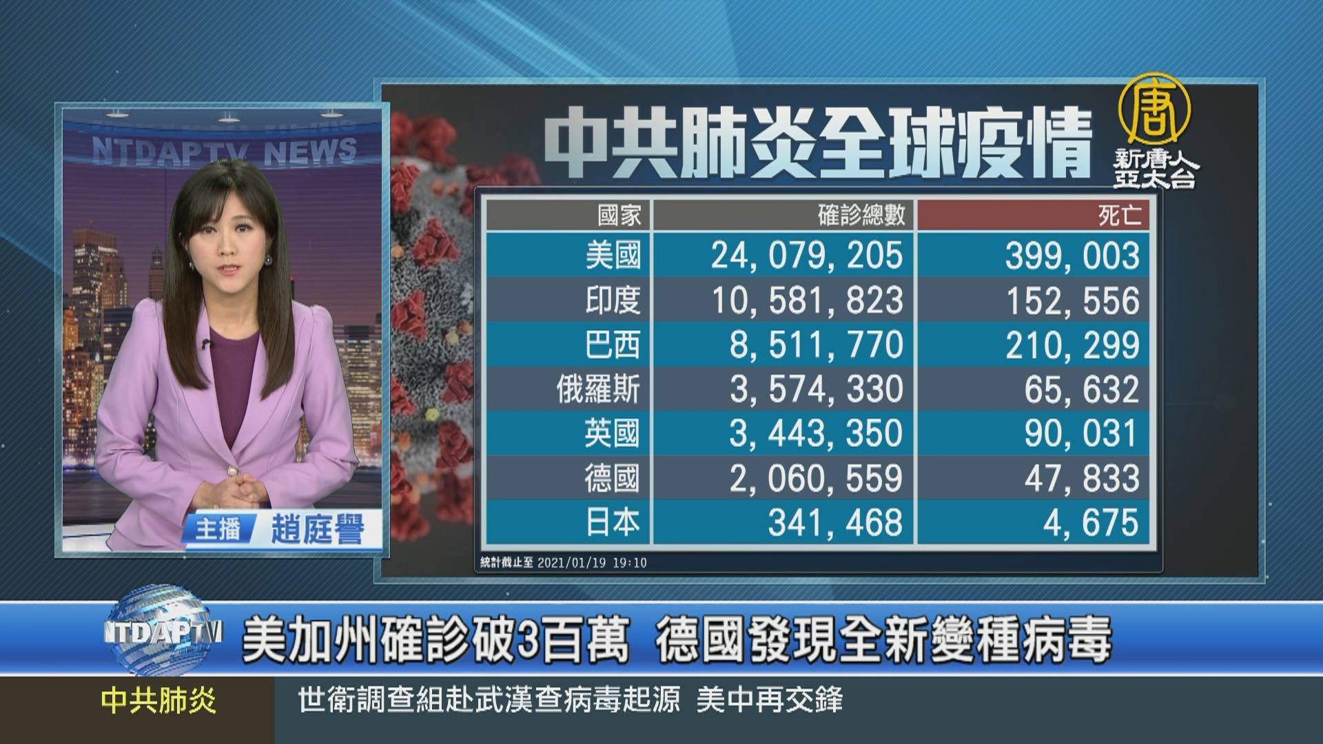 【新唐人亞太台 2021 年 01 月 19 日訊】來關心中共肺炎疫情最新情況,全球確診超過9千5百62萬人,死亡2百04萬多人。但中共、伊朗等國家,被認為嚴重低報數據。疫情最嚴重的美國累積確診突破2千4百萬人,確診病例中有60%是在去年的大選投票日之後通報的。加州成為全美第一個累計確診人數突破3百萬的州,其中超過1百萬例集中在洛杉磯。德國發現一種不同於目前已知的任何一種變種病毒株,正在進一步分析。最早在英國現蹤的變種病毒,也蔓延到捷克,捷克外交部長證實感染這種病毒。日本單日死亡人數超過1百人,達有史以來最高紀錄,重症患者也首次破千人,並且連續17天創新高。