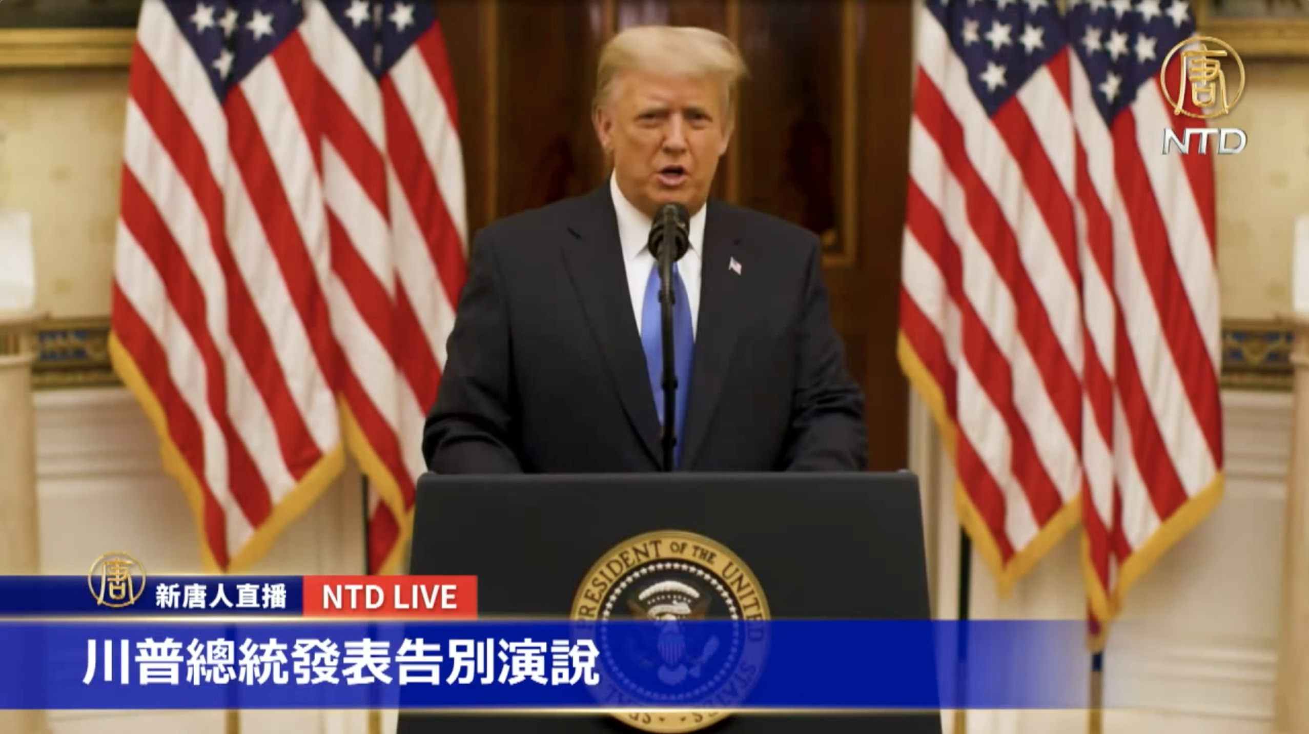 【新唐人亞太台 2021 年 01 月 20 日訊】美東時間週二(美東時間19日)下午16:30,美國總統川普(特朗普)發表告別演說。新唐人、大紀元將聯合進行直播(中文同聲翻譯)。
