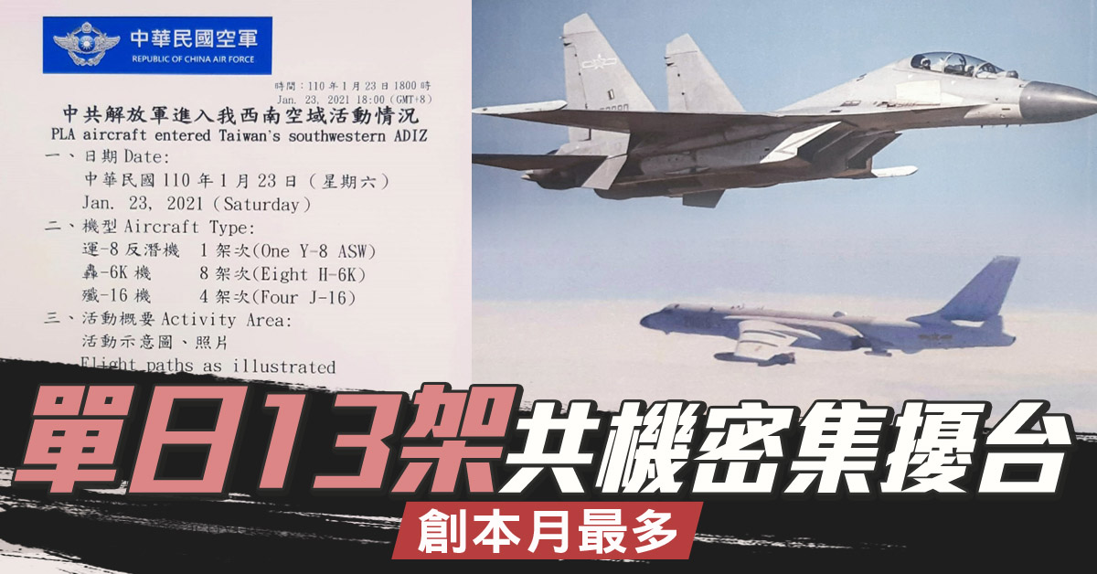 【新唐人亞太台 2021 年 01 月 23 日訊】今天總共有13架中共軍機擾台,是今年至今最大規模擾台,根據國防部發布即時軍事動態,包括一架運-8反潛機,還有八架轟-6,與四架殲-16,先後闖入台灣西南空域,中華民國空軍派遣空中巡邏兵力應對、並以廣播驅離、與啟動防空飛彈追蹤監控。媒體報導,空軍總共派出30架飛機升空攔截。而根據公開資訊,1月份有22天,紀錄到共機進入台灣空域。