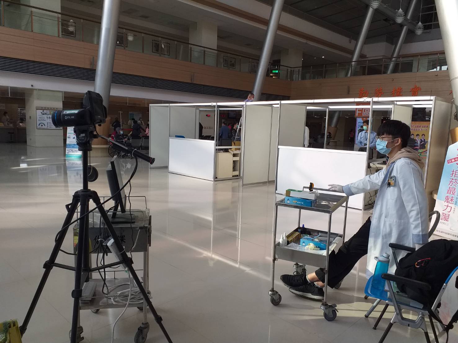 於醫院各入口處設置門禁管制站,進入醫院除體溫監控,並須讀取健保卡,詳加核對旅遊使、接觸史。(長庚醫院提供)