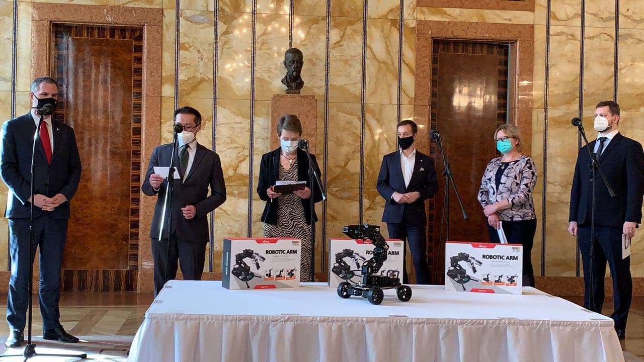 圖說一:賀吉普市長(左1)與駐捷克代表柯良叡(左2)與市府教育局官員及中學校長共同宣布台捷科學教育合作計畫,並介紹來自台灣的教學機器人手臂。(圖/中華民國外交部提供)