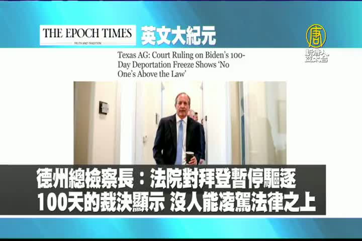 【新唐人亞太台 2021 年 01 月 29 日訊】首先來看到美國大紀元英文版報導:美國德州總檢察長表示,法院對拜登暫停驅逐100天的裁決顯示,沒有人能凌駕在法律之上。
