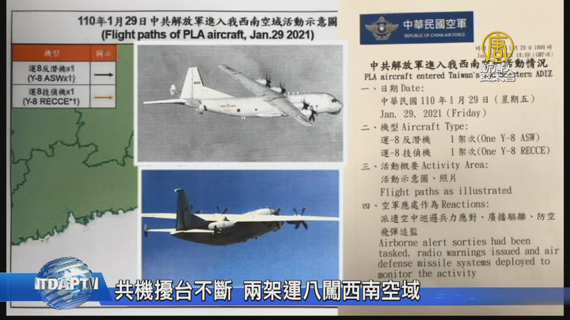 【新唐人亞太台 2021 年 01 月 29 日訊】再來關心,中共軍機持續侵擾台灣,今天29日再有一架運-8反潛機、一架運-8技偵機,闖入台灣西南空域。中華民國空軍派遣空中巡邏兵力、並以廣播驅離、和啟動防空飛彈追蹤監控。中共軍機昨天(28日)白天多架次侵擾台灣空域,晚間還有兩架殲-10戰鬥機,侵擾西南空域。另外,英國《金融時報》今天(29日)報導,共軍1月23日,拜登就任第3天,派十多架軍機侵擾台灣西南ADIZ,如今有情報披露,當時中共正模擬攻擊位於鄰近海域的美國航空母艦。