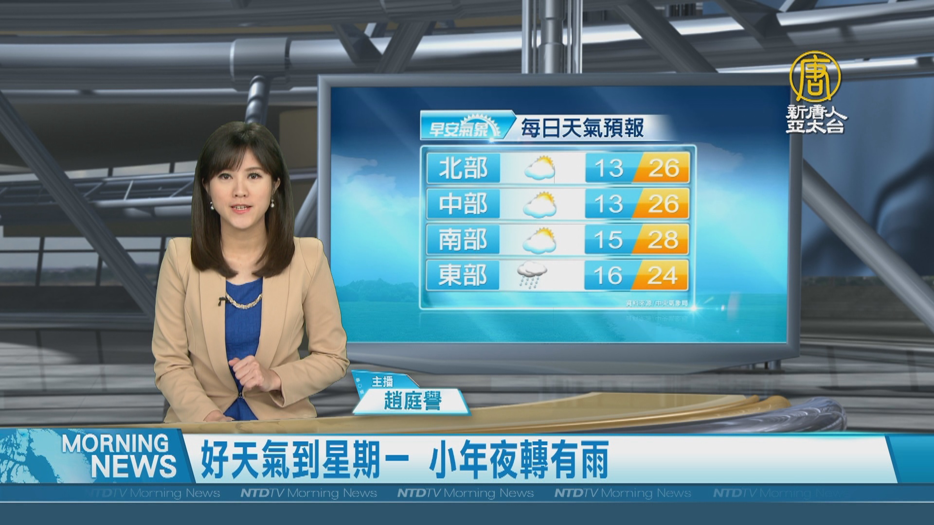 【新唐人亞太台 2021 年 02 月 04 日訊】歡迎您收看2月4日的早安新唐人,我是趙庭譽,先來帶您關心今天的天氣情況。今天持續回溫,水汽減少,一直到下周一各地多是多雲到晴的溫暖天氣。但下周二起水汽略增,下周三小年夜,到下周五大年初一,天氣不穩定;下周三前後全台降雨機率提高,估中部以北有短暫陣雨,提醒您留意。帶您一起來看到國際媒體重要訊息。
