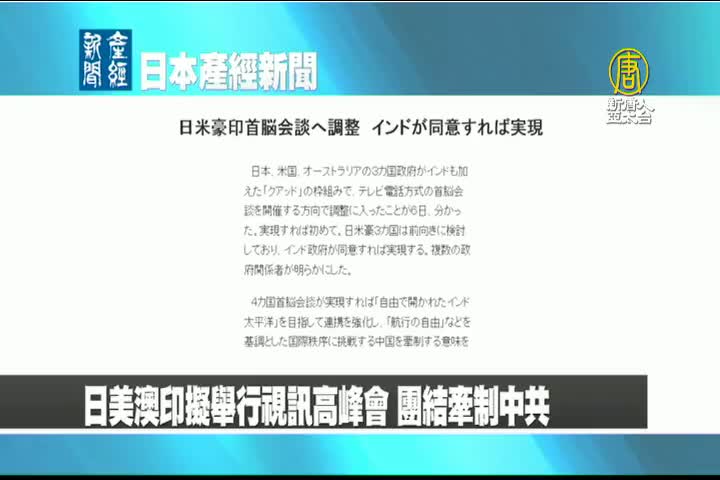 【新唐人亞太台 2021 年 02 月 08 日訊】來看到日本產經新聞報導:日本、美國、澳洲與印度擬舉行視訊高峰會,團結牽制中共。