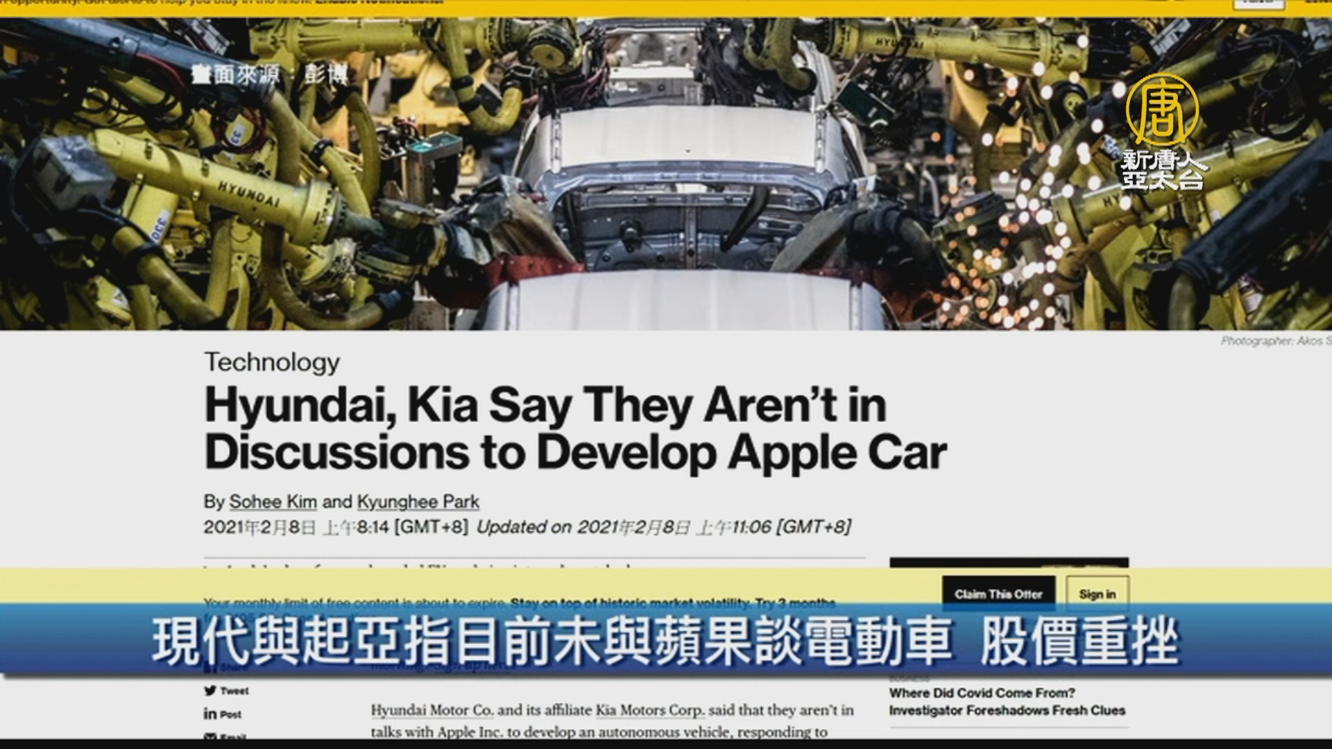 【新唐人亞太台 2021 年 02 月 08 日訊】現代與起亞指目前未與蘋果談電動車 股價重挫
