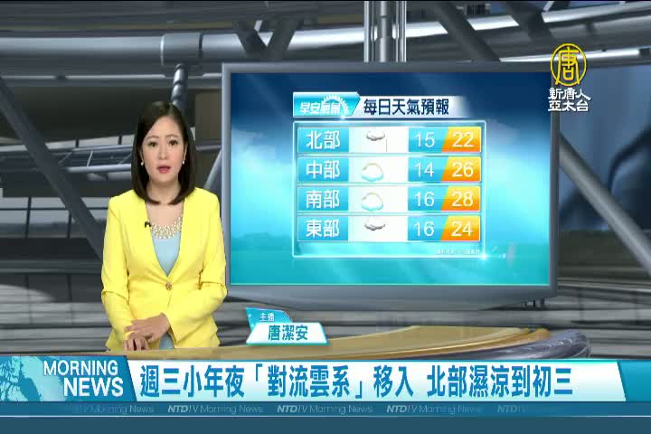 【新唐人亞太台 2021 年 02 月 09 日訊】歡迎您收看2月9日的早安新唐人,我是唐潔安,先來帶您關心今天的天氣情況。受東北季風影響,桃園以北及東半部,今天有短暫降雨,基隆北海岸及宜蘭可能有局部較大雨勢。明天小年夜鋒面接近,桃園以北及東半部有局部短暫雨;明晚到後天除夕上午雨勢轉趨明顯,全台有短暫陣雨或雷雨。帶您一起來看到國際媒體重要訊息。