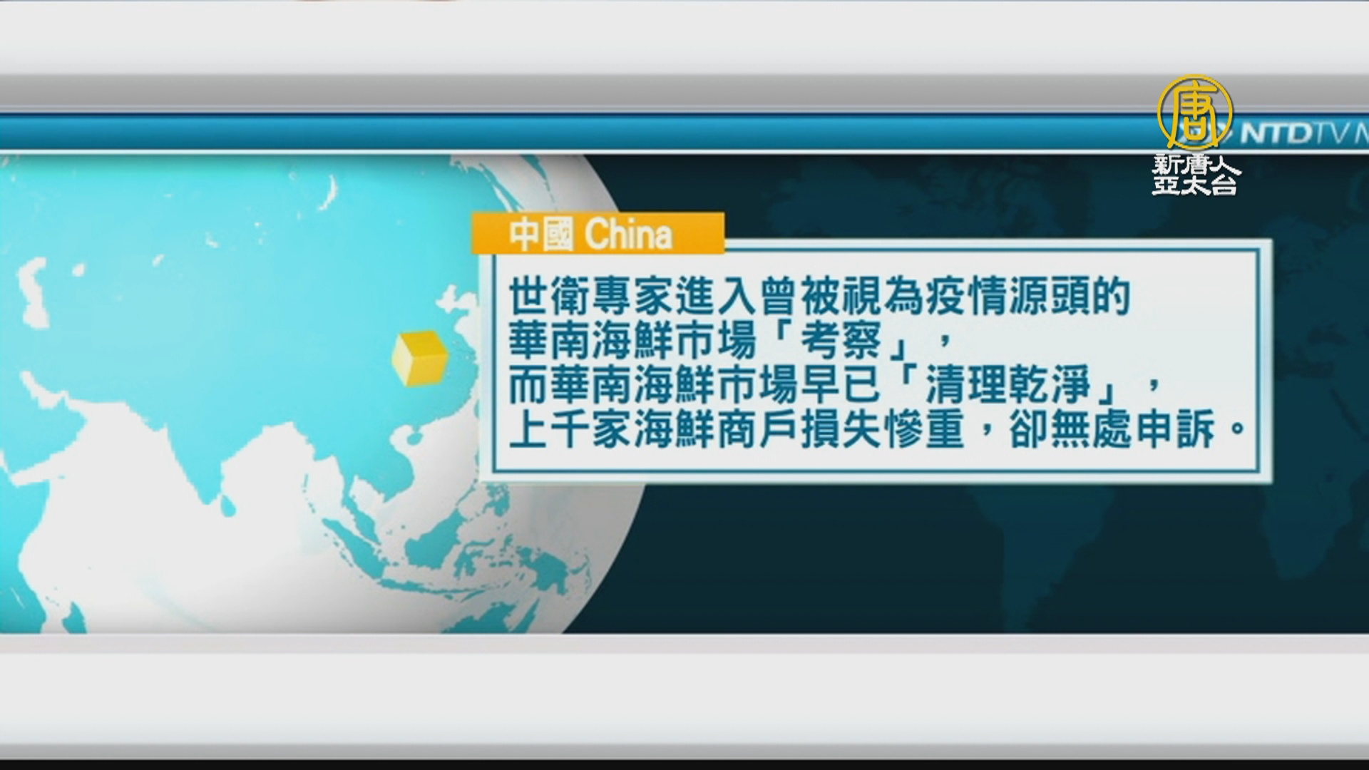 世衛專家進入曾被視為疫情源頭的華南海鮮市場「考察」,而華南海鮮市場早已「清理乾淨」,上千家海鮮商戶損失慘重,卻無處申訴。