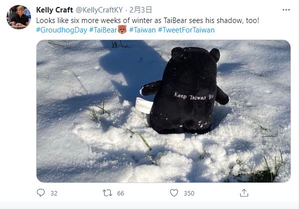 【新唐人亞太台 2021 年 02 月 11 日訊】美國前駐聯合國大使克拉夫特(Kelly Craft)再度在推特PO台灣黑熊娃娃,克拉夫特在擔任美駐聯合國大使期間,多次在推特上曝光台灣黑熊娃娃的可愛型態,2月2日美國土撥鼠日 (Groundhog Day),克拉夫特在積雪的大地上,拍了一張可愛的台灣黑熊娃娃背影,明顯露出背部「Taiwan」字樣,推文說「為台灣而推(Tweet for Taiwan)」,漫長的下雪冬季,台灣黑熊娃娃看到了自己的影子。
