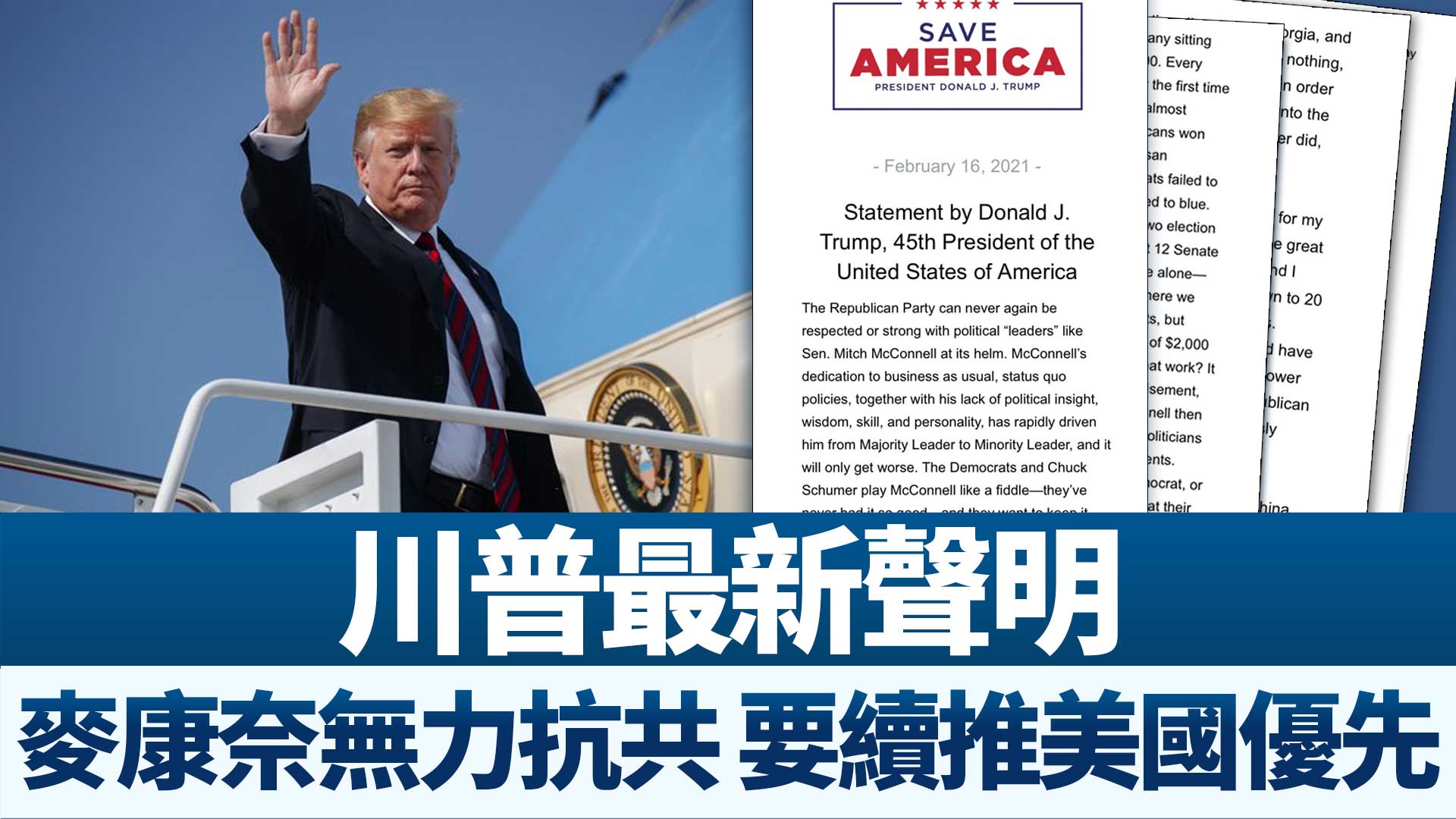 【新唐人亞太台 2021 年 02 月 17 日訊】美國第45任總統川普,今晨發布聲明指出,批評共和黨參議院領袖麥康奈,並重申2020大選被竊,將持續力推「美國優先」主張。前總統川普在聲明中表示,「有麥康奈這樣的政治領袖,共和黨將永遠不會再受到尊重和強大。」川普指出,在喬治亞和其它搖擺州發生選舉舞弊後,麥康奈完全無所作為。川普還指出,麥康奈在中國問題上已經喪失公信力,「因為他的家族持有大量的中國商業股份。」川普還在聲明中說,如果共和黨參議員繼續跟隨麥康奈,就不會有勝利;川普強調,會在必要和適當的情況下,支持那些使美國再次偉大,以及支持美國優先的主要競爭對手。