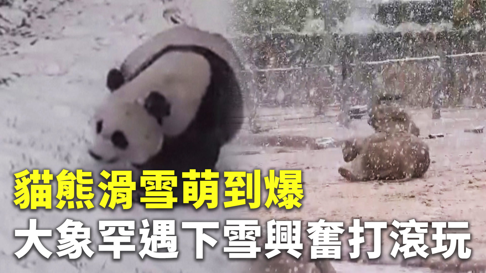 貓熊滑雪萌到爆 大象罕遇下雪興奮打滾玩