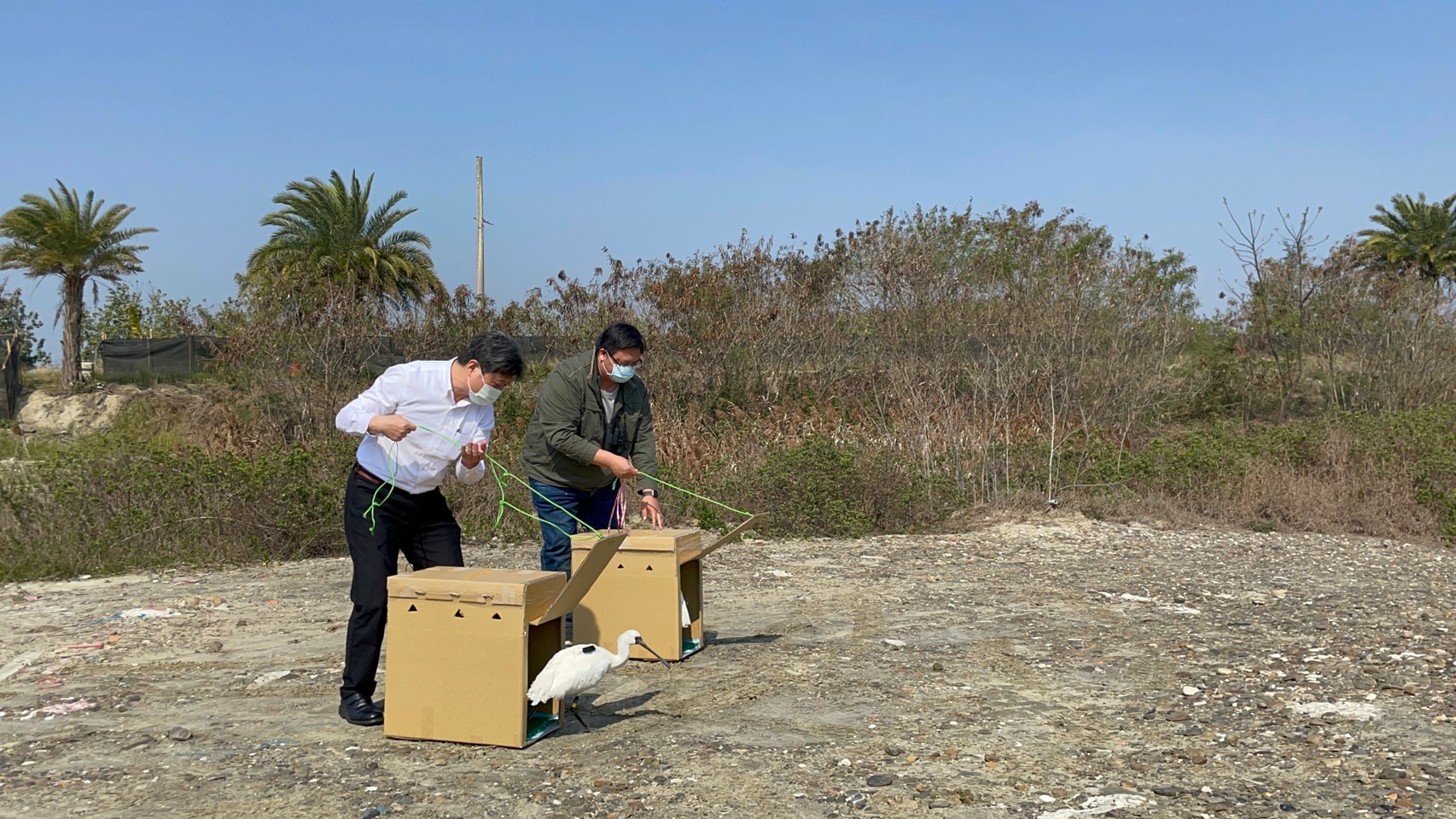 【新唐人亞太台 2021 年 02 月 20 日訊】嘉義縣政府今年2月初,陸續接獲保育團體通報,在布袋鹽田濕地周邊進行巡視調查時,發現有黑面琵鷺死亡,其中有2隻黑面琵鷺經緊急送往特有生物保育中心救治照護後,恢復狀況良好,今(20)日上午在布袋鎮新塭變電所旁(163縣道旁魚塭土堤)進行野放。