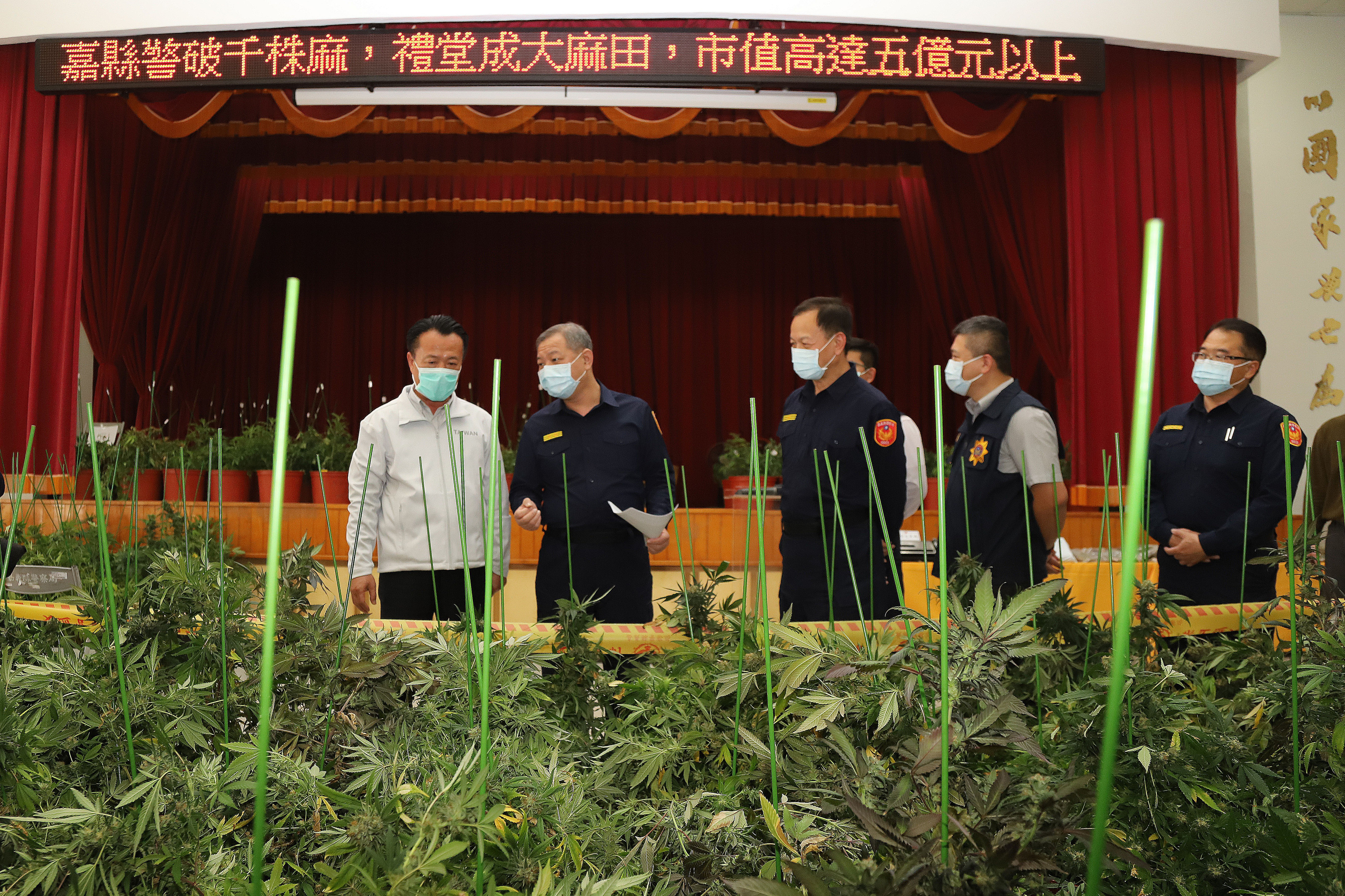 【新唐人亞太台 2021 年 02 月 23 日訊】嘉義地檢署指揮嘉義縣警局刑大、朴子分局、嘉義市警局等單位,21日在嘉義縣市等19處地點,破獲市價超過5億元的1648株大麻毒品;縣警局禮堂內一片綠油油大麻植株,為近期國內破獲最大宗大麻毒品案。