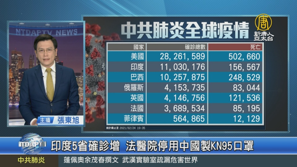 【新唐人亞太台 2021 年 02 月 24 日訊】新聞一開始,帶您關心中共肺炎疫情最新情況,全球確診超過1億1千2百14萬人,死亡2百48萬多人。但中共、伊朗等國家,被認為嚴重低報數據。疫情最嚴重的美國目前累計確診超過2千8百26萬人,死亡50萬2千多人。巴西新增確診病例超過6萬2千例、1千3百多人死亡。印度5省新增確診近來激增,疑似第二波疫情來襲。捷克前總統 克勞斯確診。法國因確診住進加護病房的病患人數再度增加,達3千4百多人,創12週以來新高。法國許多醫院決定停用中國製KN95口罩,因為擔心口罩的有效性,並質疑口罩與院內群聚感染有關。南韓即日起加強入境措施,所有旅客一律要交核酸檢測陰性證明才可以入境,來防變種病毒流入。