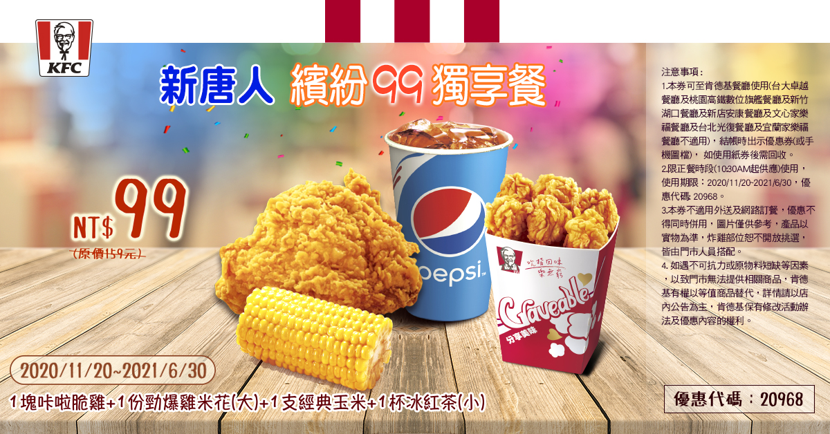 肯德基【新唐人♥️繽紛99獨享餐】優惠代碼20968