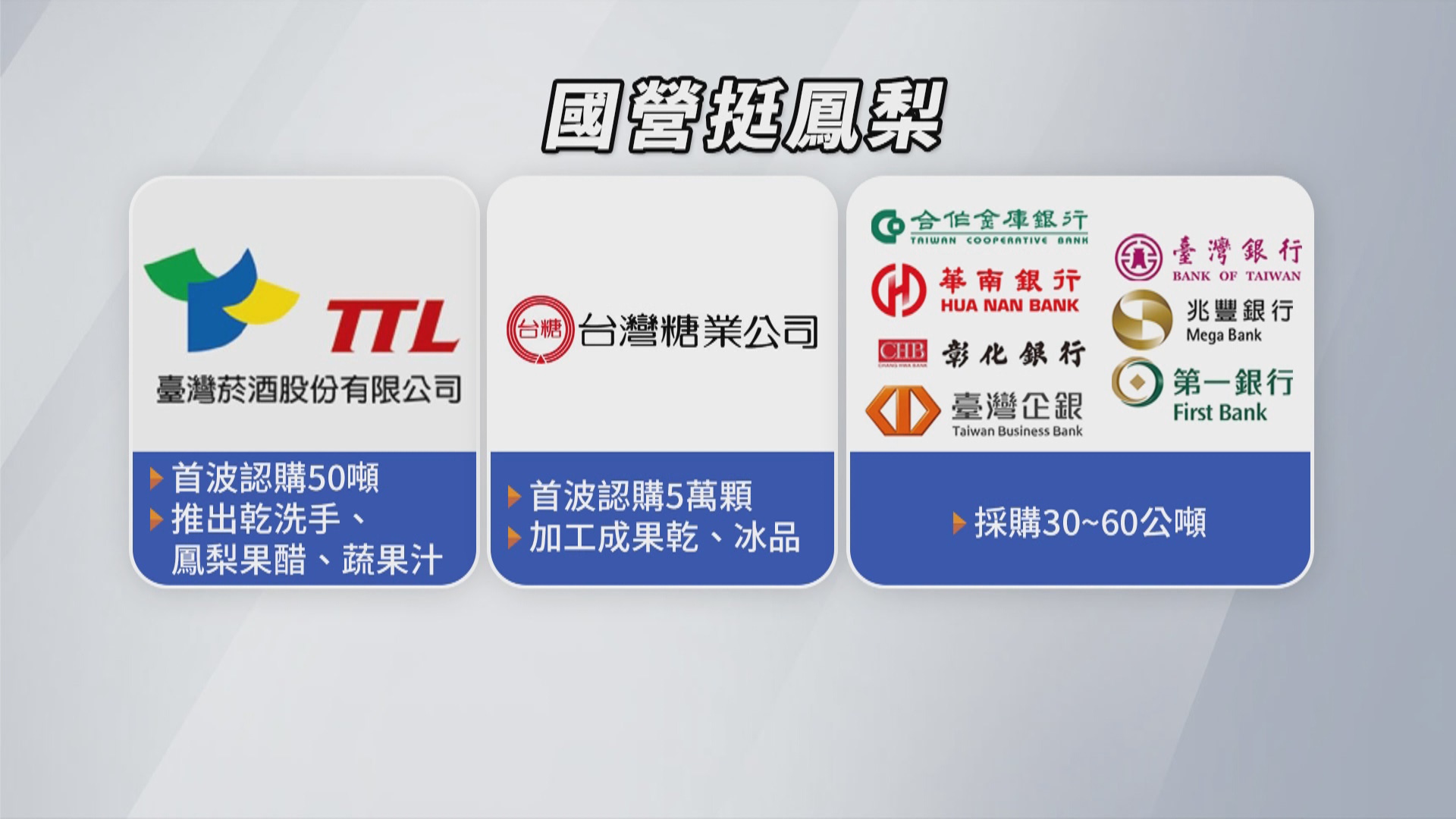 國營事業力挺台灣果農,除了中油台電職工福利會採買鳳梨,台酒第一波也預計認購50噸鳳梨,另外還要把鳳梨做成各種產品,而台糖首波則認購5萬顆,要加工成果乾、冰品,就連公股銀行台銀、一銀,兆豐銀也採購30-60公噸的鳳梨。