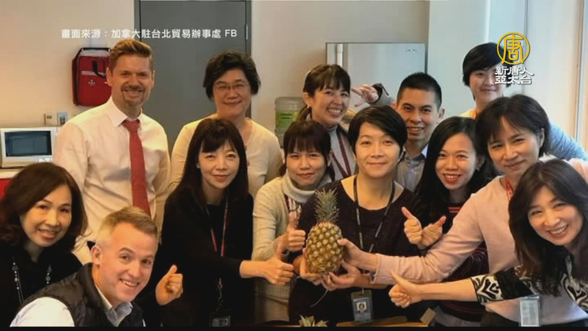 【新唐人亞太台 2021 年 03 月 03 日訊】中共突然暫停進口台灣鳳梨,國際也掀起挺台農聲浪。加拿大駐台辦事處、美國在台協會和日本台灣交流協會週二相繼刊登鳳梨圖文,力挺台農。AIT照片中,不僅辦公室內外都擺設鳳梨,連AIT處長酈英傑辦公室也出現鳳梨,文末標註「真朋友真進展」、「團結愛鳳梨」。加拿大駐台北貿易辦事處2日在臉書,端出夏威夷披薩,大讚對台灣鳳梨品質的信任。日本台灣交流協會週二也在臉書上分享協會人員吃鳳梨的照片。捷克台灣商會也發文,「#FreedomPineapples」。響應外交部長吳釗燮發起的自由鳳梨標籤,為自由的滋味讚聲。