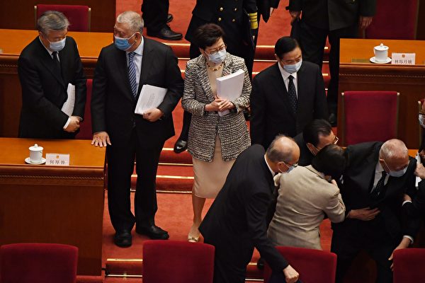 3月5日上午,中共全國政協副主席、香港前特首董建華(右一)在離場時跌倒。(LEO RAMIREZAFP via Getty Images)