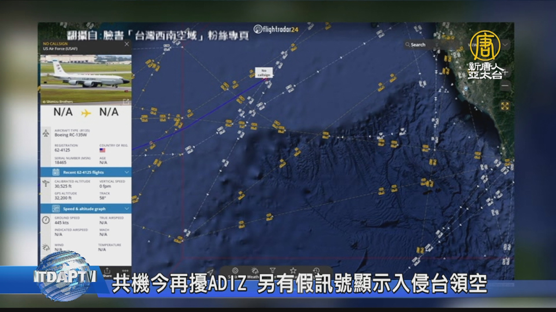 【新唐人亞太台 2021 年 03 月 08 日訊】新聞頭條,帶您來關心,臉書「台灣西南空域」粉絲專頁,記錄到共機在今天上午11點與下午3點,進入台灣防空識別區(ADIZ)的西南空域,並遭到台灣空軍廣播驅離,這也是連續兩天有共機擾台。不過,在民間 FLIGHTRADAR24平台上,則另外記錄到:上午 10點40分左右,有共機運8 闖入台灣領空的航跡,但隨後這說法遭到空軍司令部否認。臉書「台灣西南空域」版主許耿睿研判,這次紀錄,是因為定位計算錯誤造成的假訊號。