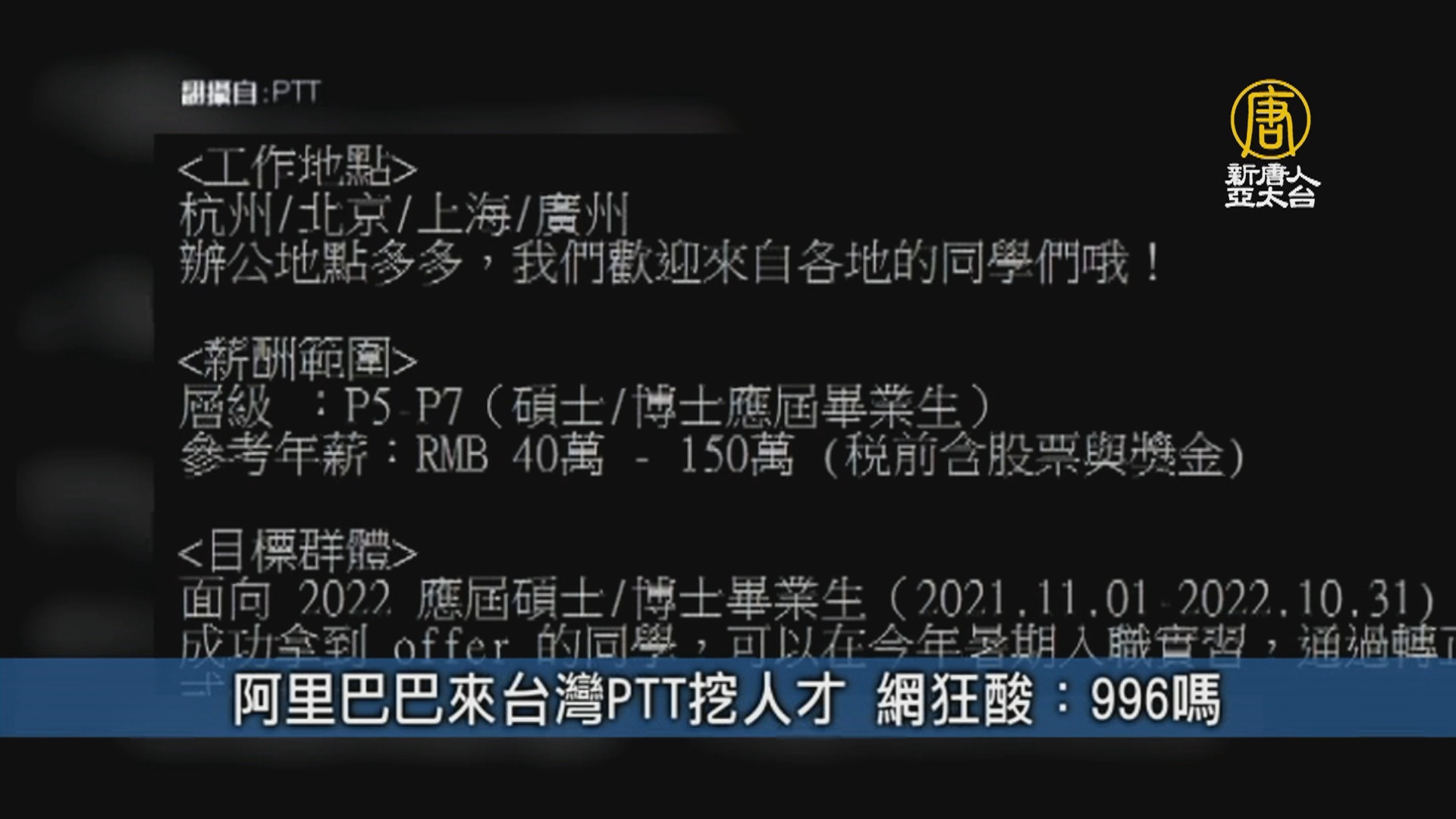 日前,台灣熱門網上討論區PTT科技板上有貼出阿里巴巴集團「2022應屆畢業生招聘」宣傳文,稱年薪在40萬至150萬元(人民幣,下同)。由於沒有寫每天工作時間,台灣網民問道:「是996嗎 ?」