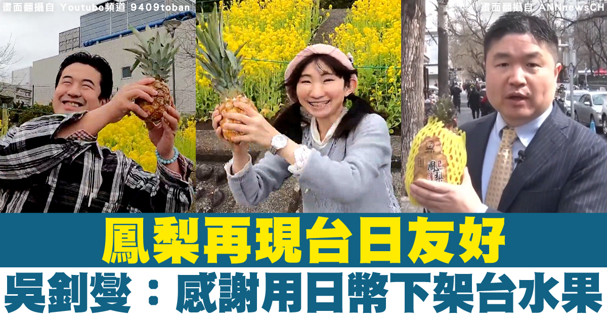 台灣鳳梨國際爆紅,日本網友更是大玩創意做出鳳梨歌,不僅搖著鳳梨跳舞,更在歌詞中稱讚台灣人善良、東西好吃等,表達對台灣的愛意。面對中共突襲禁台灣鳳梨,日本上演鳳梨搶購潮,外交部長吳釗燮在日台活動致詞中,感謝日本。