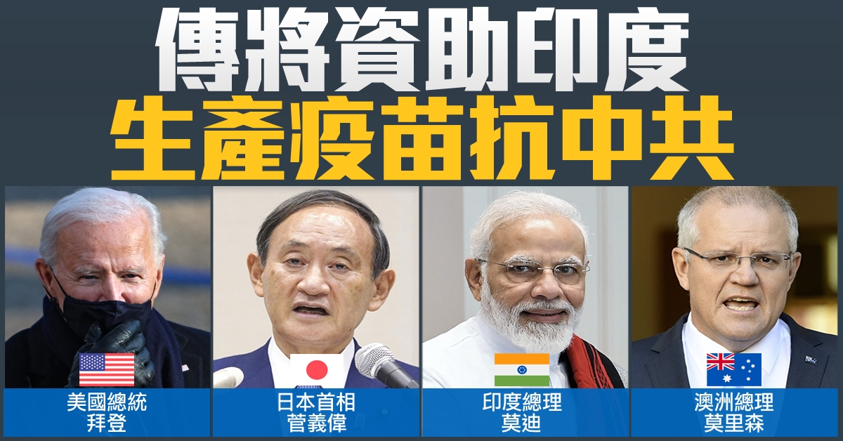 美國、日本、印度和澳洲12日將首度舉行「四方安全對話」領袖峰會,一位美國高層官員表示,峰會擬宣布財政協議,支持在印度增產2019冠狀病毒疾病疫苗,以供東南亞國家使用。