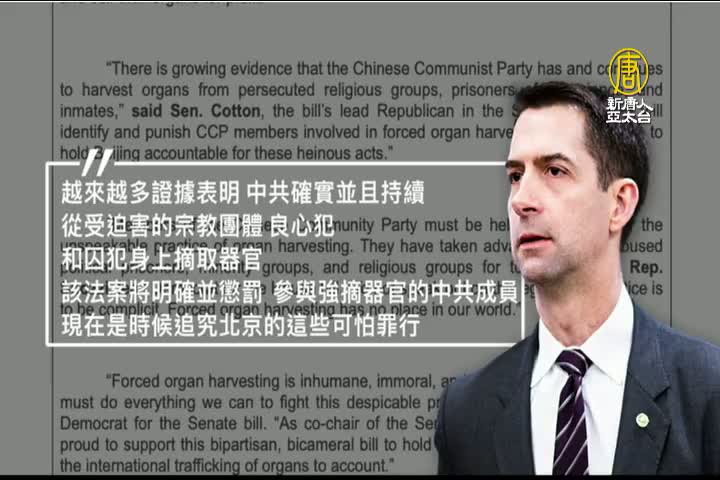 參議員 湯姆‧克頓表示:「越來越多證據表明,中共確實並且持續從受迫害的宗教團體、良心犯和囚犯身上摘取器官。」「該法案將明確並懲罰,參與強摘器官的中共成員。現在是時候追究北京的這些可怕罪行。」