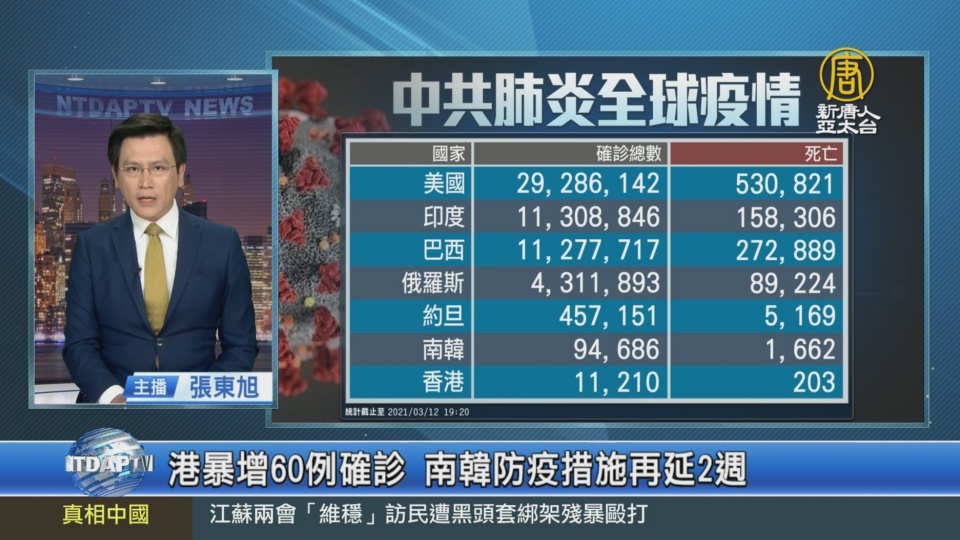 【新唐人亞太台 2021 年 03 月 12 日訊】再來關心,中共肺炎疫情最新情況,全球確診超過1億1千8百58萬人,死亡2百63萬多人。但中共、伊朗等國家,被認為嚴重低報數據。巴西新增確診7萬5千多例、連續2天單日死亡超過2千人。印度過去一週,各地確診病例不斷增加,專家推測可能是第二波疫情浪潮的開始。瑞典王儲維多利亞公主及夫婿威斯特林親王都證實確診。約旦新增8千3百例確診,創下單日新增病例數新高。南韓連續4天確診超過4百例,決定再延長現行防疫措施兩星期。紐西蘭最大城奧克蘭,連續兩週零本土感染案例後,宣布解除一切防疫限制。香港新增60例確診,創1月27日以來新高,其中健身中心群聚感染增加47例,官方擔憂可能出現第5波疫情。