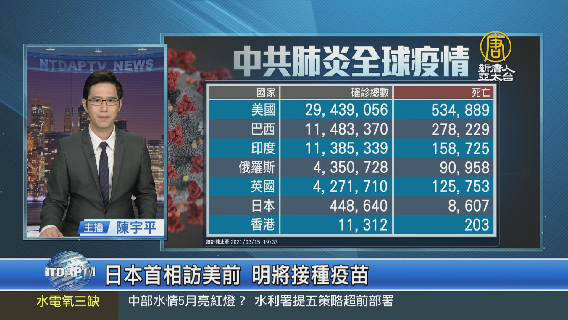 【新唐人亞太台 2021 年 03 月 15 日訊】再來關心中共肺炎動態,目前全球公開數據,累計確診 1億1千9百多萬人,累計死亡 265萬人。其中,中共、伊朗等政權,被認為嚴重低報數據。美國目前累計 2千9百43萬人確診,53萬人死亡。巴西累計 1千1百48萬人確診,27.8萬人死亡。日本全境及東京,最近一週新增病例數持續增加,首相菅義偉明天(16日)將接受第一次疫苗接種,以應對4月上旬訪問美國。香港新增 30例確診,其中14例是境外移入。