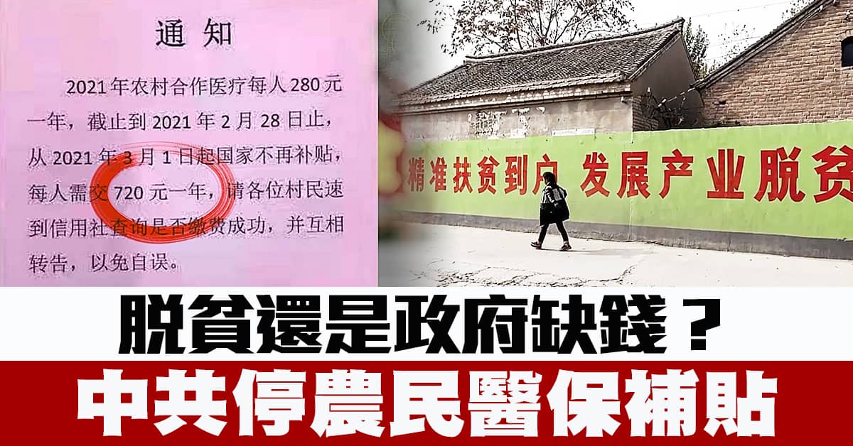【新唐人亞太台 2021 年 03 月 17 日訊】就在中共宣稱創造所謂全面脫貧的「人間奇蹟」後,隔天農村就出現新的公告,表示政府將不再補貼農民醫療費。農民還沒嘗到脫貧的滋味,迎來的卻是沉重的生活開銷。