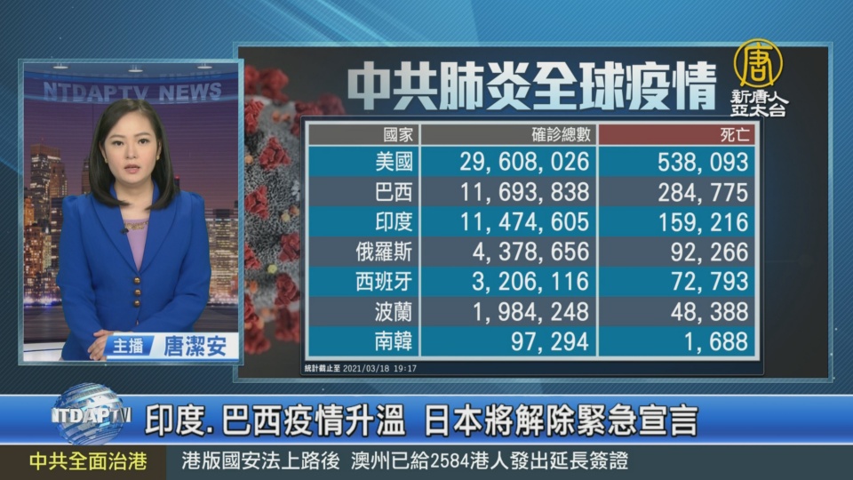 【新唐人亞太台 2021 年 03 月 18 日訊】來關心中共肺炎疫情最新情況,全球確診超過1億2千129萬人,死亡2百68萬2千多人。美國疫情逐漸趨緩,連續9星期確診數呈現下降趨勢。印度過去幾週,70個縣市通報的新增病例成長了150%。巴西多個地區通報的新病例數都創歷史新高,半數以上州份的醫院病床數幾乎滿床。波蘭疫情升溫,宣布從週六起實施部份封城3星期。聯合國最新的研究聲明指出,中共肺炎未來可能成為「季節性疾病」,呼籲不能因為氣候變化作為調整防疫措施的標準。西班牙發生3例民眾接種AZ疫苗後形成血栓個案,其中1人死亡,死因還在調查中。南韓出現第2例接種AZ疫苗後出現血栓的現象。日本政府決定,東京等首都圈1都3縣的緊急事態將如期在21日解除。