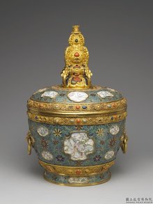 故宮南院表示,清宮融入漢人飲茶文化,也保留了滿族居住塞外時期的飲奶茶習俗;這次換展亮點,是將蒙藏茶器獨立一區,陳列金胎掐絲琺瑯彩繪、瓷仿拉古里木紋、鑲嵌寶石的多穆壺、奶茶罐、奶茶碗等,件件裝飾精緻,僧帽造型壺口則可一窺遊牧民族宗教與飲茶風俗的交互影響。