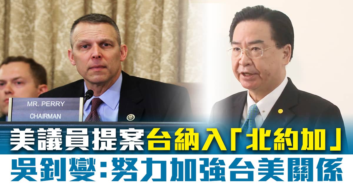 外交部長吳釗燮表達感謝之意,因為美國的友台提案又多了一項,美國共和黨聯邦眾議員裴利(Scott Perry)提出法案,要求美國行政當局將台灣視為「北約加」(NATO Plus)的國家成員,以加強美台防務合作。吳釗燮表達感謝外,也強調,台灣要有自我防衛的義務。