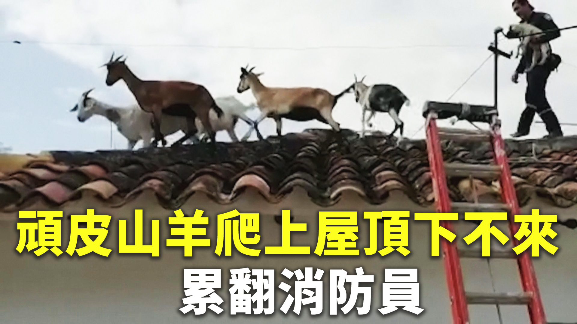 頑皮山羊爬上屋頂下不來 累翻消防員