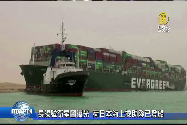 【新唐人亞太台 2021 年 03 月 26 日訊】接著來看關心,長榮貨櫃輪長賜輪擱淺事件已經進入第三天。從最新的衛星照片上可以看到,長賜輪仍然卡在蘇伊士運河的河道上,幾乎沒有移動的跡象。長榮海運指出,日本船東已經指派來自荷蘭及日本的海上專業救助團隊登輪,與船長和運河管理局研擬更有效的浮船方案,全力協助長賜號儘早脫困。