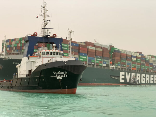 蘇伊士運河管理局稍早表示,在船首周圍挖除2萬立方公尺沙土之後,已重新開始用拖曳方式幫助貨輪脫淺。