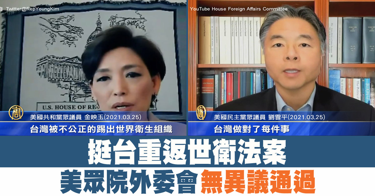 【新唐人亞太台 2021 年 03 月 27 日訊】美國眾議院外委會週四通過法案,指示國務卿協助台灣重獲世衛觀察員身分。多位議員在會中發聲力挺法案,強調台灣為全球衛生領袖,對國際作出諸多貢獻,抱屈台灣因為遭到中共施壓被排除在外。