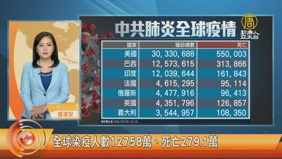 【新唐人亞太台 2021 年 03 月 30 日訊】新聞開始,關心疫情,全球確診超過 1億2千758萬人,死亡 2百79萬多人。但中共、伊朗等國家,被認為嚴重低報數據。全美累計確診超過 3千萬人,死亡55萬人。巴西新增 3.9萬例確診、1千6百多人死亡,因防疫不力,外交部長與國防部長週一雙雙宣布辭職。另外,印度疫情惡化,死亡人數比前一週增加 51%。