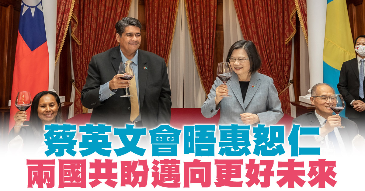總統蔡英文親自到總統府前大門迎接到訪的帛琉總統惠恕仁,兩人以手肘相互碰致意,並一起走到會客廳,蔡英文在致詞時表示,從防疫到觀光,都說明台灣和帛琉的長期互相信任,已建立出可靠的合作模式,未來兩國一定可以寫下很多成功的故事。