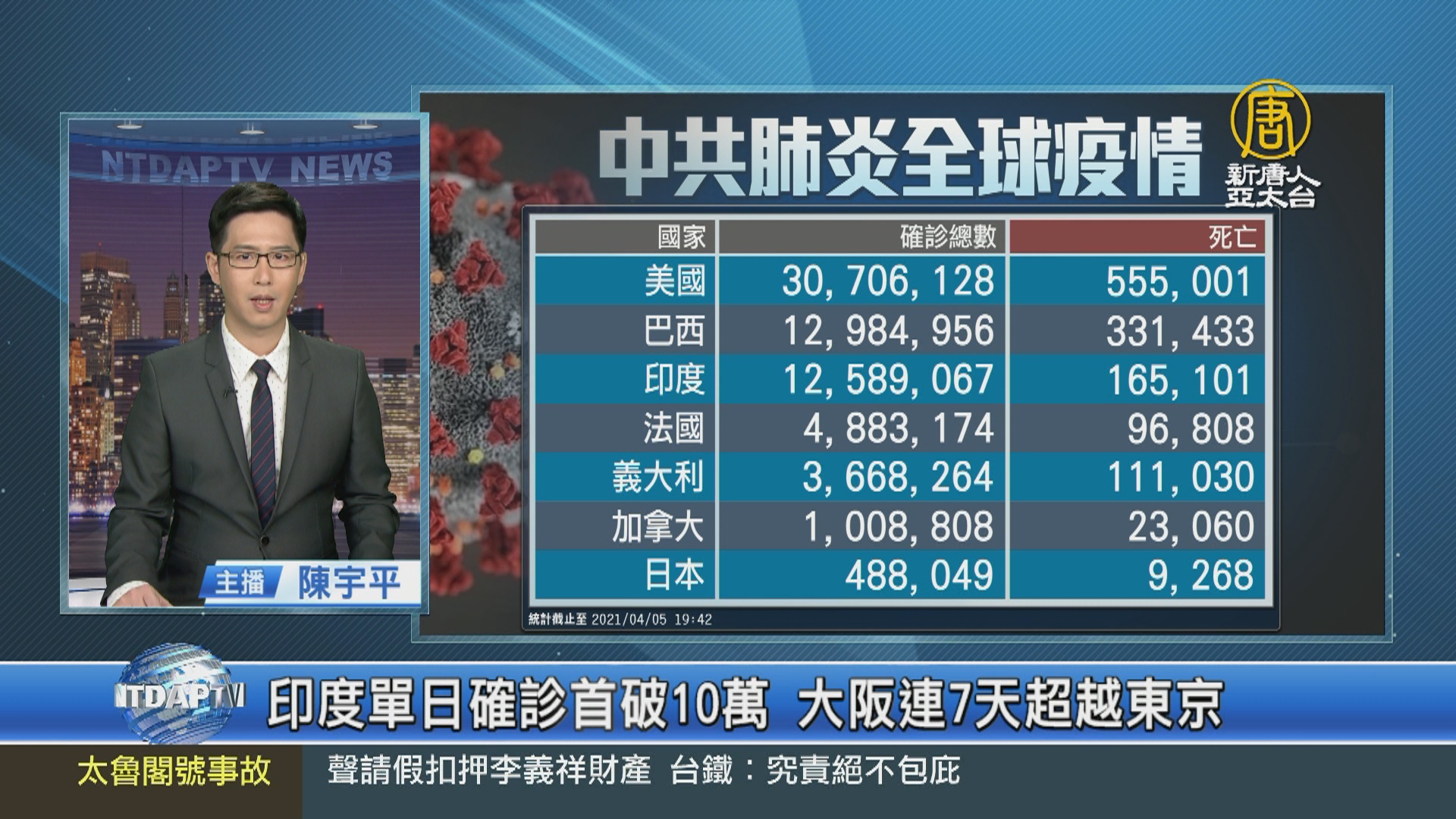 【新唐人亞太台 2021 年 04 月 05 日訊】再來關心,中共肺炎疫情最新情況,全球確診超過1億3千137萬人,死亡2百85萬4千多人。但中共、伊朗等國家,被認為嚴重低報數據。印度單日新增確診首度超過10萬人,印度在今年2月初確診創下多月新低後,每日新增確診暴增約12倍,寶萊塢明星阿克夏庫瑪,宣布確診。歐洲方面,法國4日新增6萬6千多起確診。義大利累計有11萬1千多人染疫死亡,排名歐洲第2多。加拿大面臨第三波疫情,確診人數突破百萬大關。日本大阪新增341例確診,連續7天超越東京,為了防止疫情擴大,5日起大阪府等6座城市開始適用「防止蔓延等重點措施」為期一個月。而台灣指揮中心宣布,今天新增一例境外移入,是印尼籍的20多歲女學生。