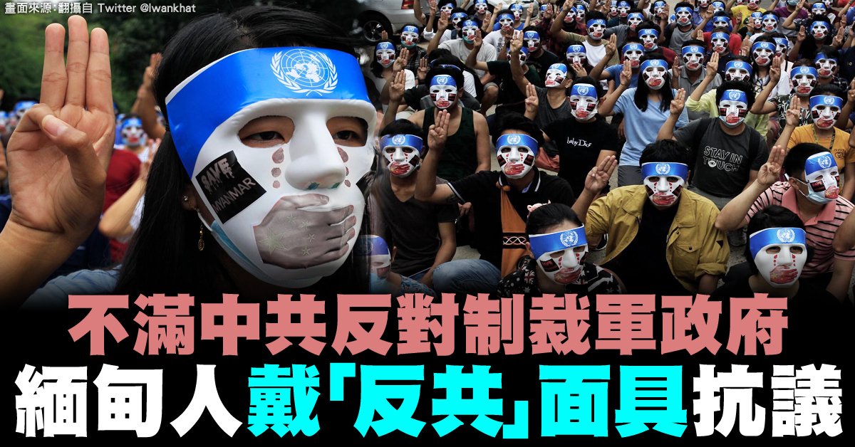 在推特上也可以看到,許多緬甸民眾戴著「反中共噤聲聯合國」的面具,表達不滿。面具最上方是聯合國標誌,中間則是一隻畫有五星旗的手,摀住嘴巴,兩旁寫著「救救緬甸」(Save Myanmar)。