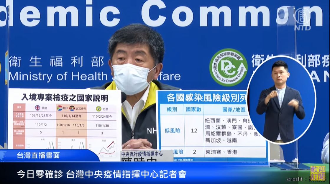 【新唐人亞太台 2021 年 04 月 07 日訊】中央流行疫情指揮中心今(7)日表示,今日無新增確診病例。另外,指揮中心也公布,自4月12日起,開放第二、三類接種對象,包括中央及地方政府防疫人員及高接觸風險工作者等對象接種COVID-19疫苗。