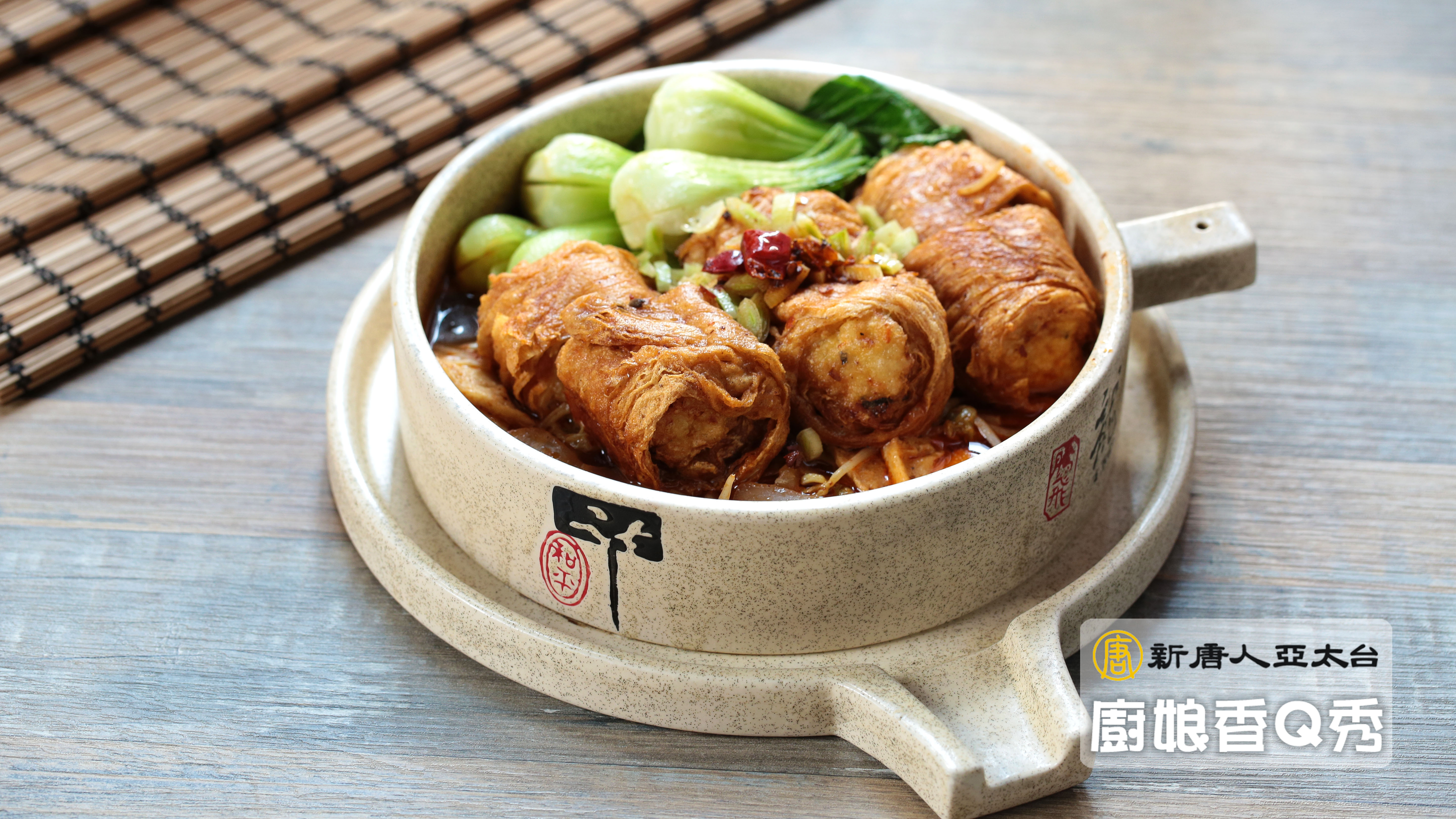 8. 加胡椒粉、香菇粉及高湯或水調味。再放入炸酥的豆腐皮捲。青江菜略煮一下,擺入碗中。