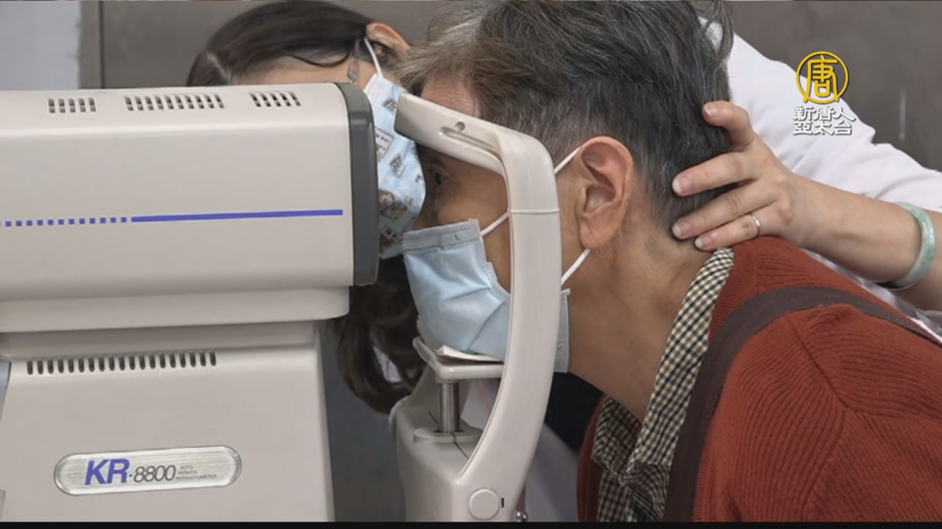 長輩坐在椅子上,額頭緊貼電腦驗光機,經專業驗光師驗出視力度數後,還要帶上試鏡片,讓雙眼都找到最佳度數,才能讓配出來的眼鏡戴起來更舒適。
