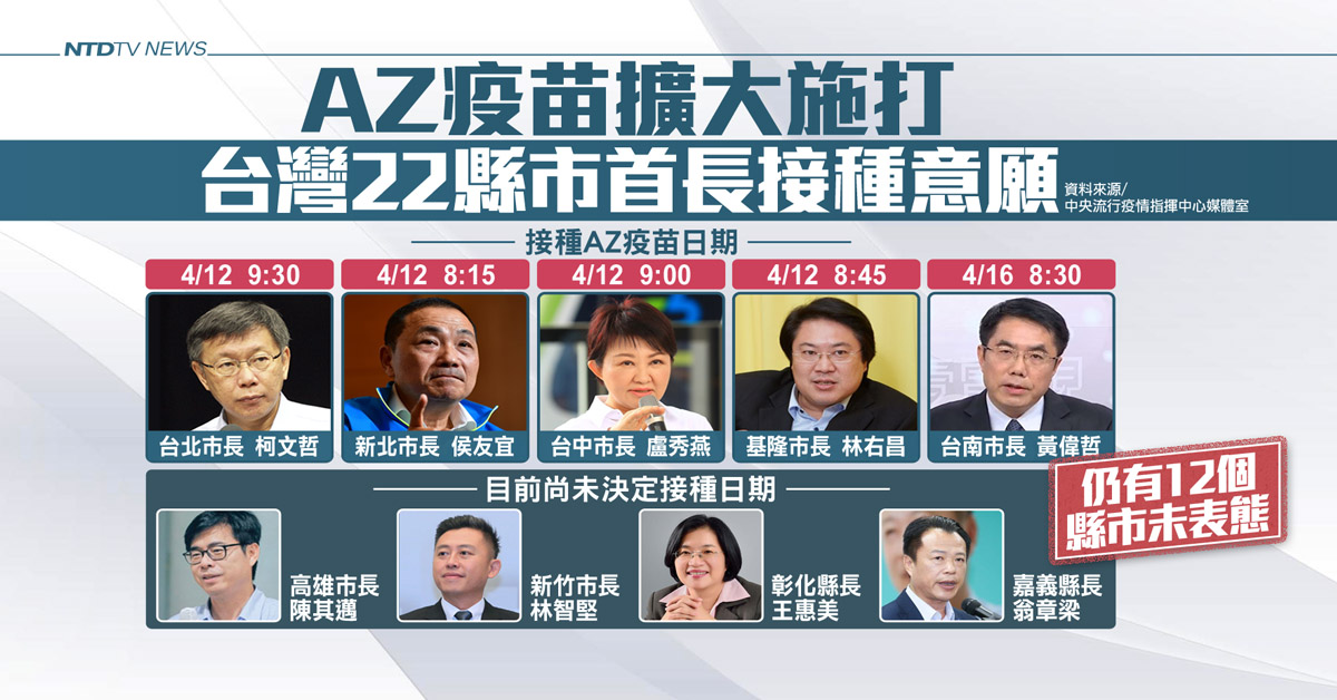 【新唐人亞太台 2021 年 04 月 10 日訊】台灣AZ疫苗在下週一開始擴大施打,全台22縣市目前共有10縣市首長,表態帶頭接種。中央流行疫情指揮中心副指揮官陳宗彥,及醫療應變組副組長羅一鈞,和 2名防疫醫師,也將到桃園醫院接種疫苗。