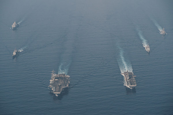 4月9日,美軍羅斯福號航母(CVN71,左前)艦隊和馬克辛島號兩棲攻擊艦(LHD 8,右前)艦隊在南海演練。(美國海軍)