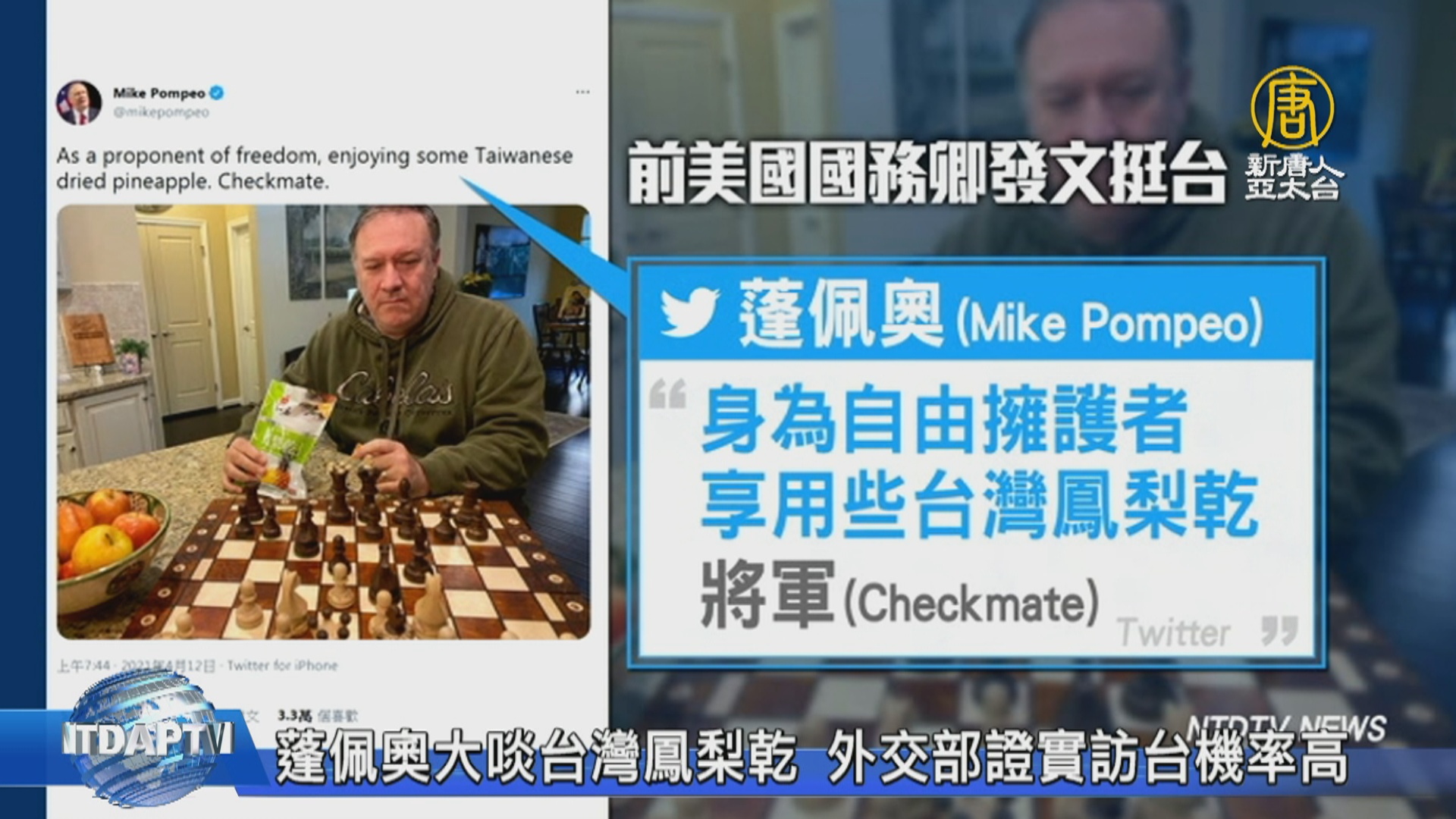 【新唐人亞太台 2021 年 04 月 12 日訊】新聞一開始,帶您看到,中共在2月底宣布停止進口台灣鳳梨,掀起一波支持「自由鳳梨」運動。前美國國務卿蓬佩奧今天也在推特發文,貼出他邊下棋邊吃台灣鳳梨乾的照片,再次展現挺台立場。而眼尖的台南市長黃偉哲,發現這包鳳梨乾是來自台南官田,也立即在臉書上向蓬佩奧致謝,並邀請他來台南參訪。另外有立委質詢時,關切蓬佩奧今年訪台機率大不大,外交部也給予正面回應。